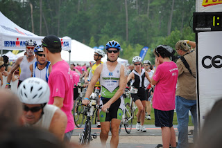 Swim Recap - If I had to do this over again I would have worn my wetsuit. The temp was still cool enough (79 degrees) that I would not have overheated and the time savings a wetsuit provides would have allowed me to get ahead of the middle instead of being caught up in it. I also would have started at the front and to the right in my wetsuit and sprinted for about 500m. This would have allowed me to get out in front and find a rhythm that I was unable to utilize. Another reason we did not use a wetsuit is because we were told that the people who used one would not be in the AG rankings and thus be listed in a separate ranking. This was not the case as wetsuit swimmers were ranked right along with everyone else. Those who choose the wetsuits made the right decision. The lesson from this is that if you can use a wetsuit do it! Also, it would have given me some extra padding to absorb some of the beating (-: